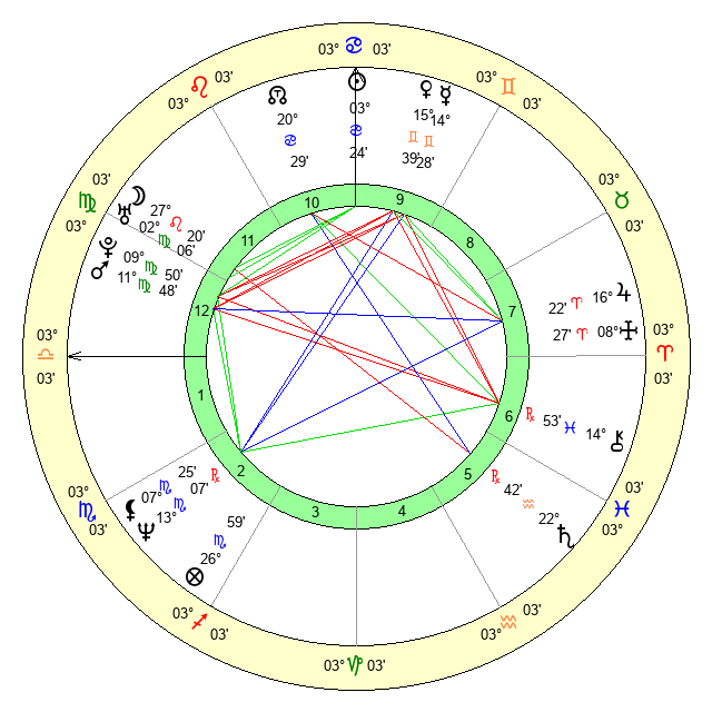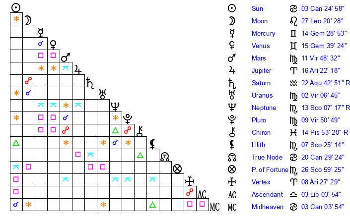 | Moon | 27 Leo 25 | 8 Cancer 1 | 26 Scorpio 29 |