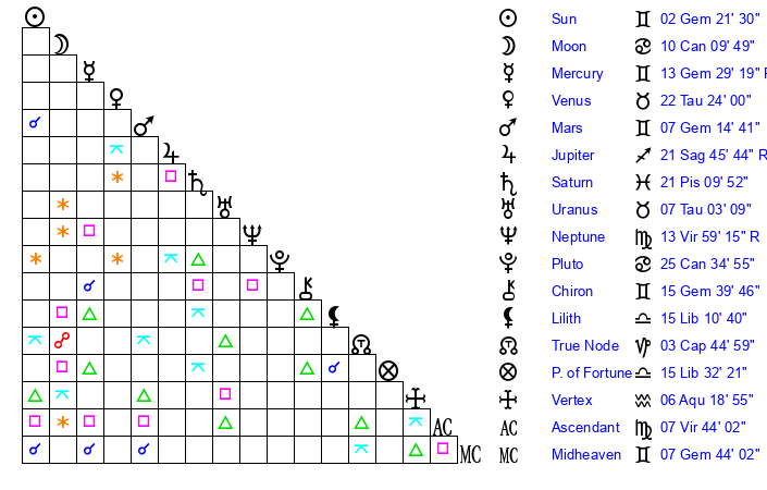 | Sun | 2 Gemini 21 | 2 Gemini 49 | 27 Leo 27 |