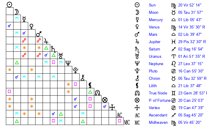 | Sun | 20 Virgo 52 | 22 Virgo 8 | 28 Sagittarius 51 |