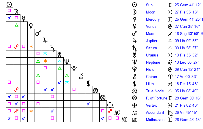 | Moon | 27 Pisces 50 | 12 Pisces 43 | 13 Capricorn 58 |