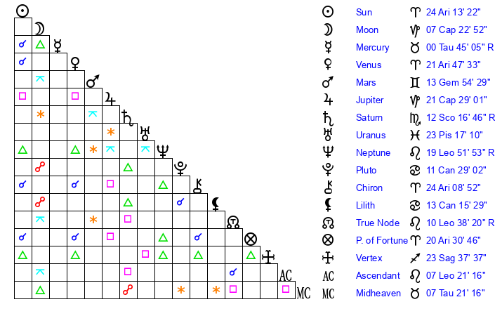 | Neptune | 19 Leo 51 | 0 Aries 33 | 21 Leo 29 |