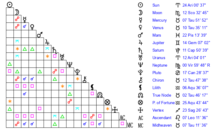 | Venus | 10 Taurus 36 | 24 Pisces 42 | 4 Virgo 39 |