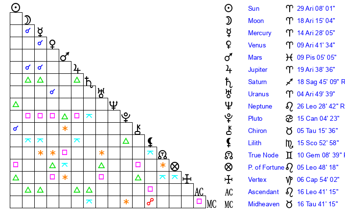 | Sun | 29 Aries 8 | 29 Aries 38 | 2 Leo 13 |