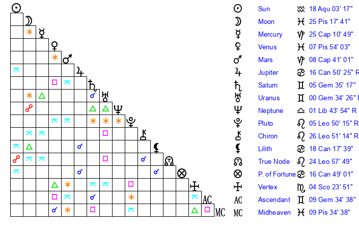 | Moon | 25 Pisces 16 | 19 Gemini 48 | 23 Pisces 18 |