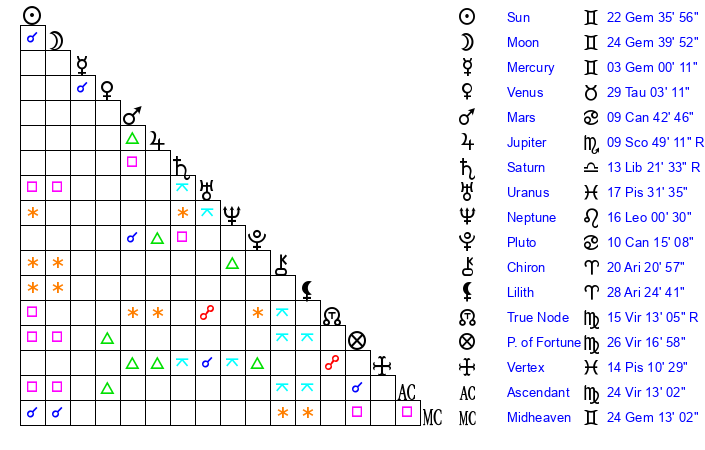 | Sun | 22 Gemini 36 | 23 Gemini 53 | 0 Libra 37 |