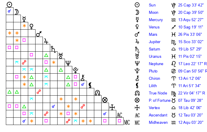 | Mercury | 13 Aquarius 52 | 12 Capricorn 9 | 26 Taurus 28 |