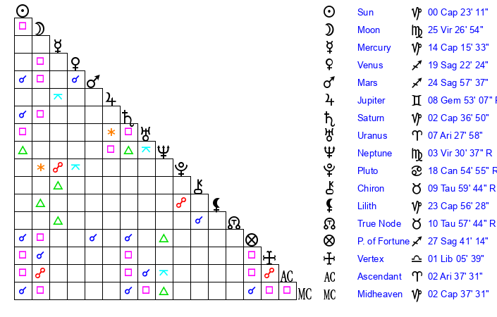 | Sun | 0 Capricorn 23 | 1 Capricorn 21 | 6 Aries 18 |