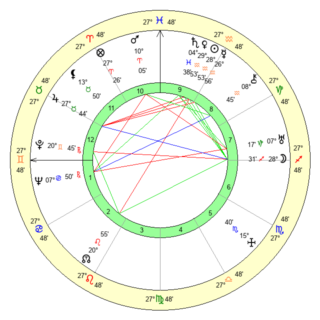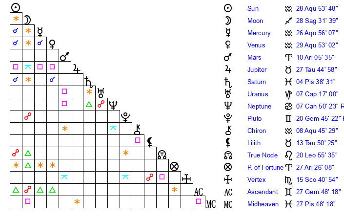 | Sun | 28 Aquarius 54 | 0 Pisces 2 | 25 Gemini 19 |