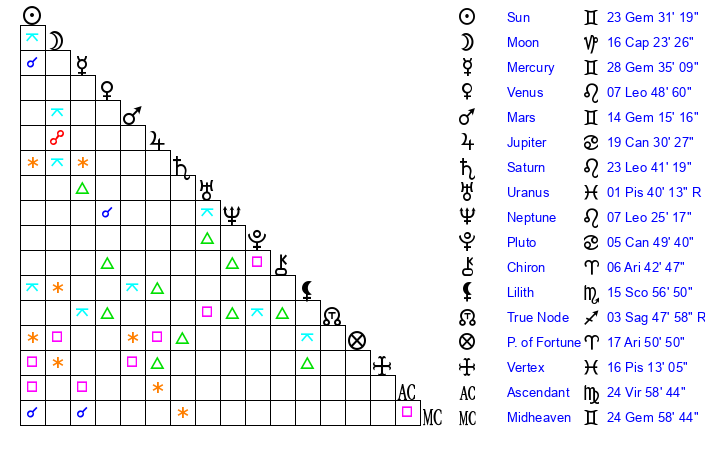 | Sun | 23 Gemini 31 | 24 Gemini 50 | 5 Libra 29 |