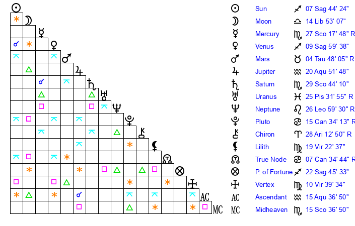 | Venus | 10 Sagittarius 0 | 29 Scorpio 50 | 13 Aries 47 |