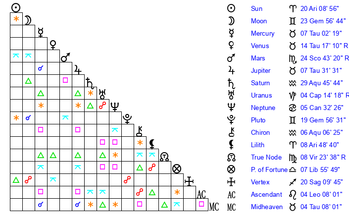 | Sun | 20 Aries 9 | 21 Aries 4 | 15 Leo 26 |