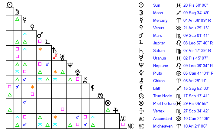 | Neptune | 9 Leo 8 | 29 Pisces 17 | 9 Leo 51 |