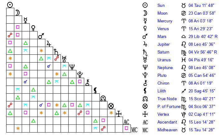 | Sun | 4 Taurus 11 | 4 Taurus 46 | 14 Leo 50 |