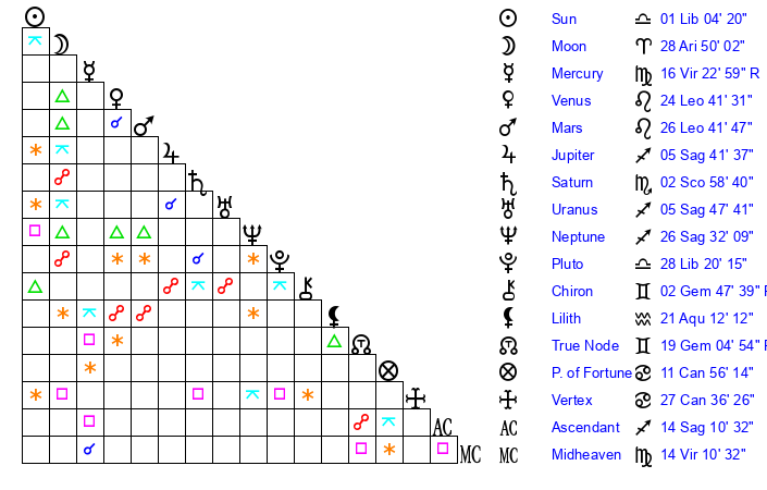 | Moon | 28 Aries 54 | 3 Scorpio 59 | 22 Scorpio 32 |