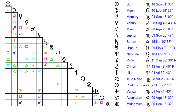 | Neptune | 18 Leo 9 | 29 Pisces 35 | 16 Leo 20 |