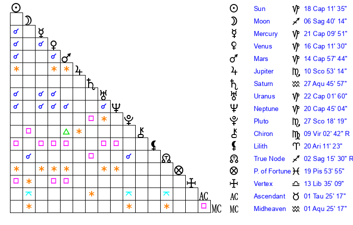 Moon | 6 Sagittarius 43 | 11 Taurus 11 | 27 Capricorn 3 |