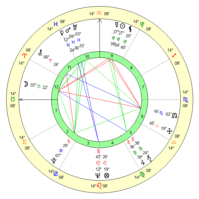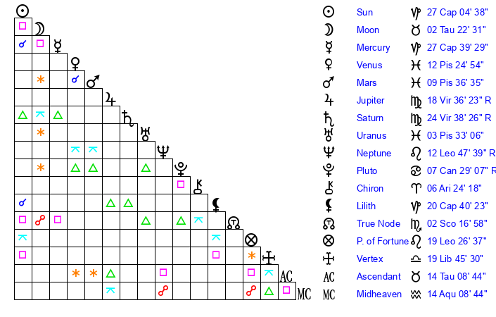 | Moon | 2 Taurus 27 | 12 Virgo 30 | 27 Aquarius 26 |