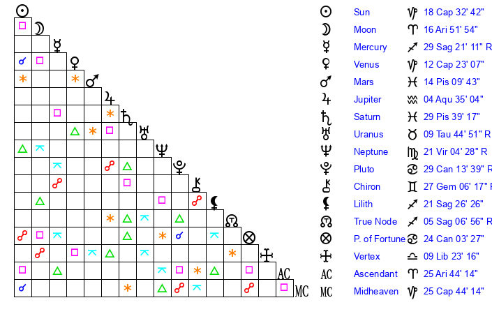 | Sun | 18 Capricorn 32 | 19 Capricorn 26 | 15 Aries 59 |