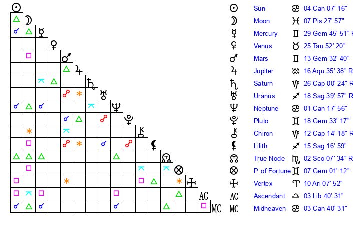 | Jupiter | 16 Aquarius 15 | 3 Cancer 51 | 8 Aquarius 0 |