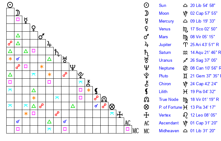 | Uranus | 26 Sagittarius 34 | 0 Gemini 53 | 2 Capricorn 56 |