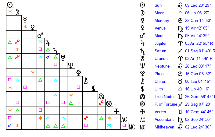 | Neptune | 26 Leo 4 | 1 Aries 57 | 29 Leo 2 |