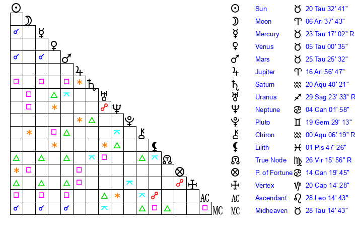 | Sun | 20 Taurus 32 | 21 Taurus 15 | 16 Virgo 33 |