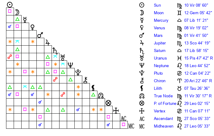 | Mercury | 7 Libra 12 | 2 Virgo 12 | 7 Capricorn 9 |