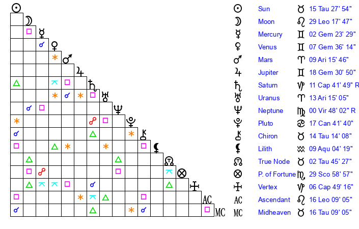 | Sun | 15 Taurus 28 | 16 Taurus 27 | 16 Leo 24 |