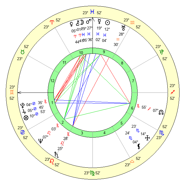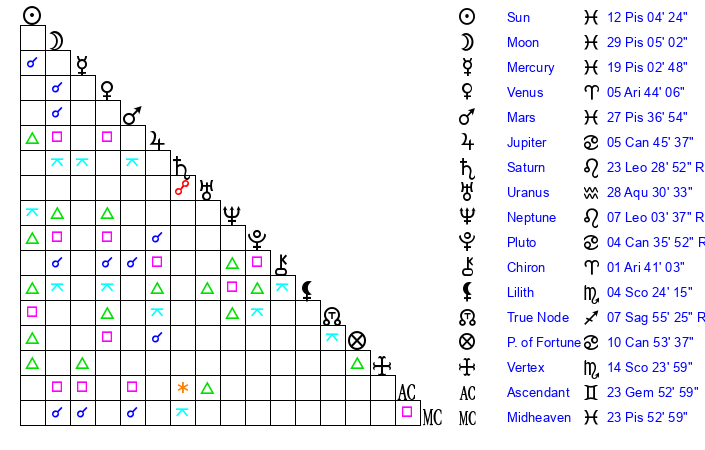 | Sun | 12 Pisces 4 | 13 Pisces 22 | 25 Gemini 26 |