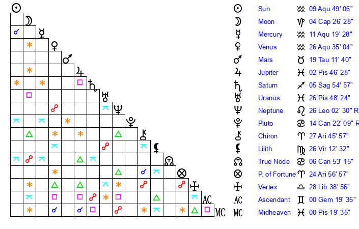 | Sun | 9 Aquarius 50 | 11 Aquarius 3 | 17 Taurus 6 |
