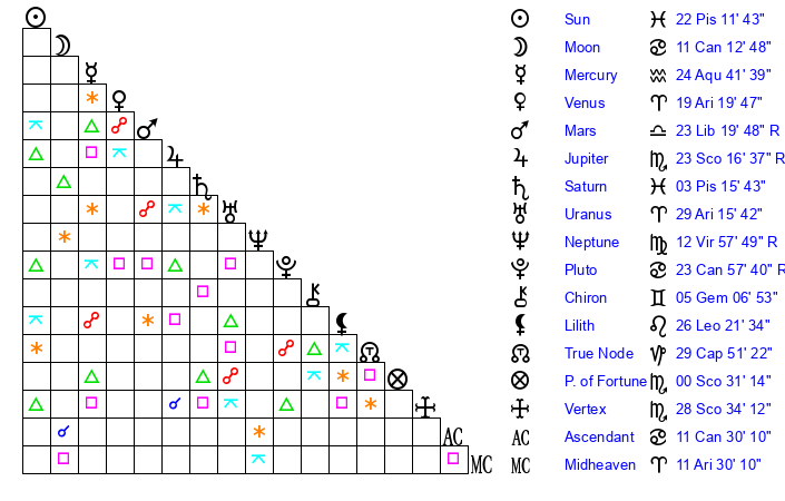 | Sun | 22 Pisces 11 | 23 Pisces 22 | 19 Gemini 49 |