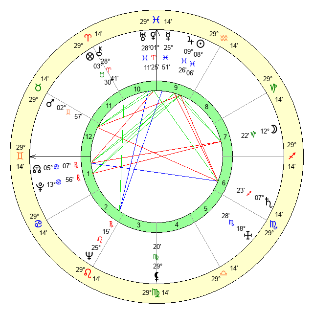 | Jupiter | 9 Pisces 23 | 12 Gemini 10 | 29 Pisces 51 |