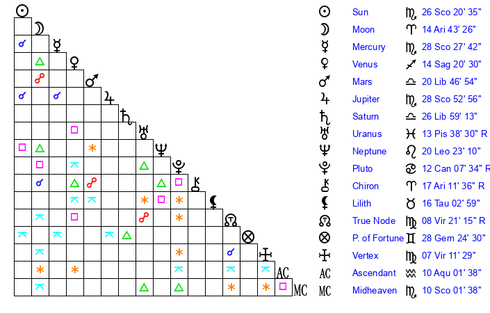| Moon | 14 Aries 43 | 21 Scorpio 22 | 8 Capricorn 4 |
