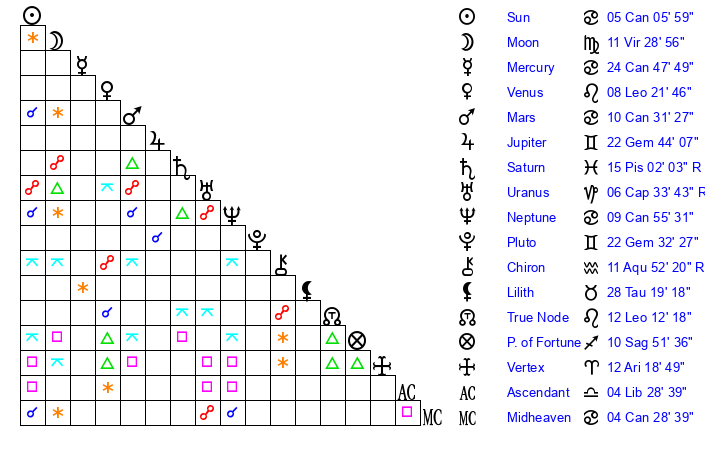 | Moon | 11 Virgo 30 | 6 Leo 16 | 1 Aquarius 59 |