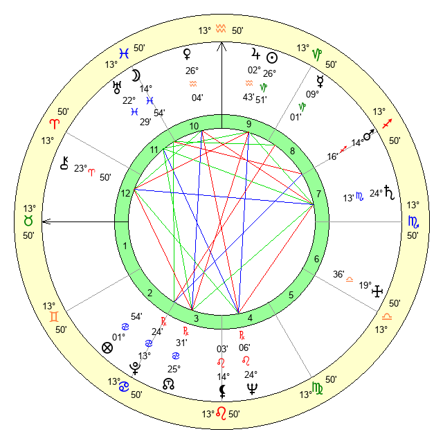 | Moon | 14 Pisces 46 | 12 Virgo 30 | 20 Libra 18 |