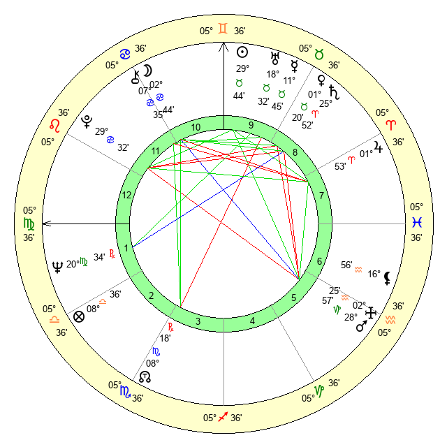 | Sun | 29 Taurus 44 | 0 Gemini 53 | 21 Leo 57 |