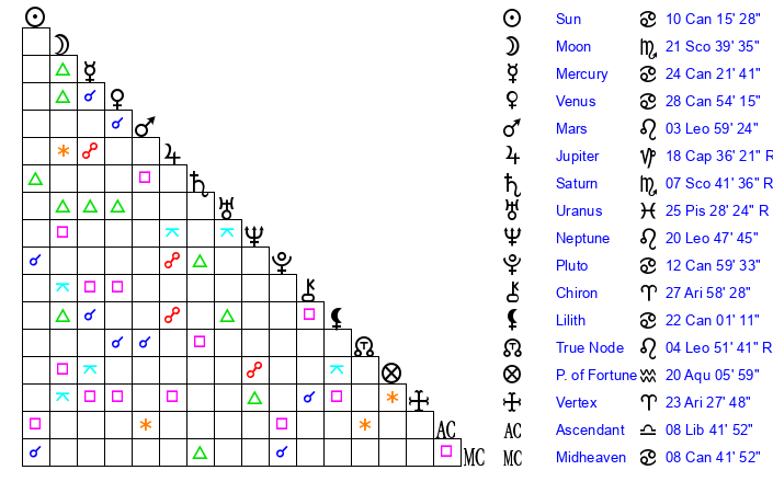 | Moon | 21 Scorpio 36 | 9 Libra 59 | 27 Cancer 3 |