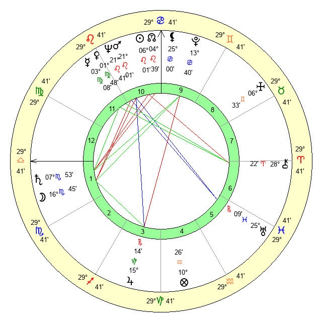 | Moon | 16 Scorpio 41 | 5 Libra 49 | 23 Cancer 1 |
