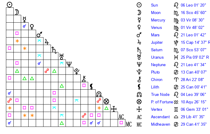 | Moon | 16 Scorpio 41 | 5 Libra 49 | 23 Cancer 1 |