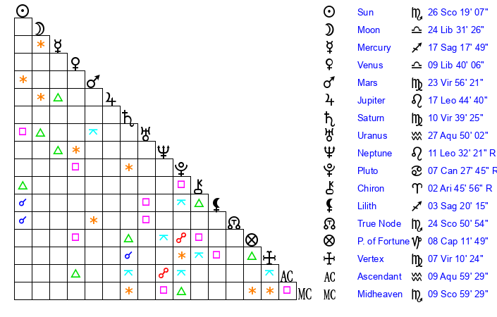 | Moon | 24 Libra 29 | 21 Scorpio 22 | 11 Virgo 37 |