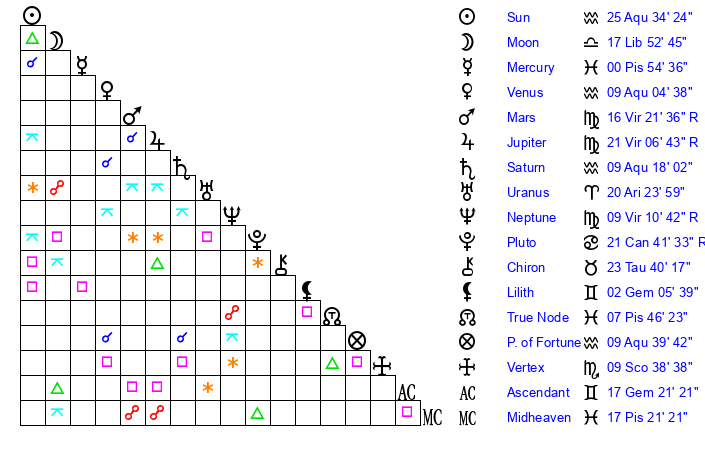 | Saturn | 9 Aquarius 29 | 18 Pisces 54 | 16 Aquarius 29 |