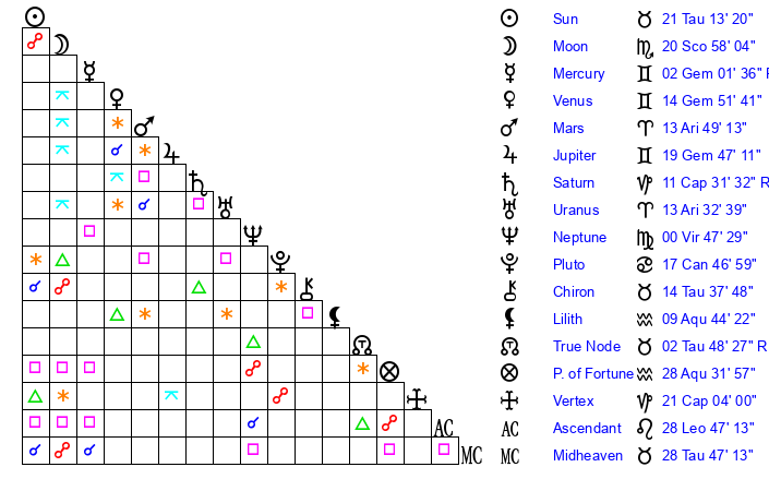 | Moon | 20 Scorpio 51 | 22 Scorpio 14 | 1 Taurus 7 |