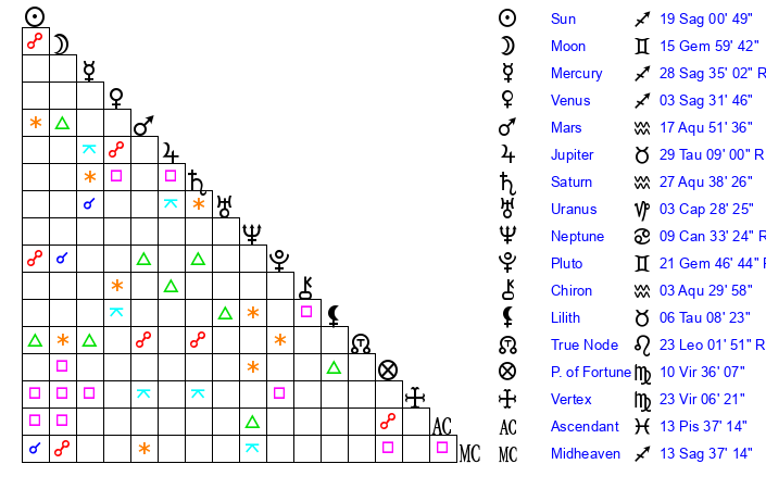 | Venus | 3 Sagittarius 32 | 13 Sagittarius 40 | 3 Taurus 40 |