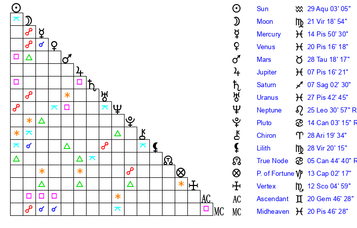 | Sun | 29 Aquarius 3 | 0 Pisces 17 | 5 Gemini 24 |