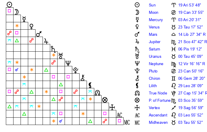 | Sun | 19 Aries 53 | 21 Aries 4 | 16 Cancer 32 |