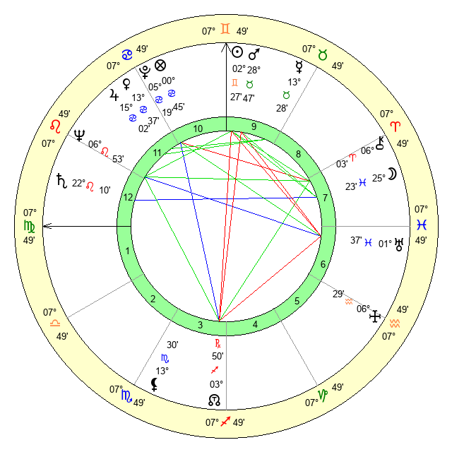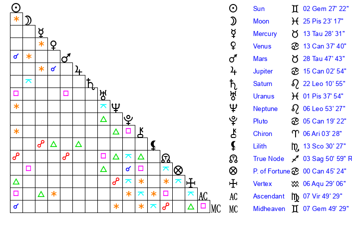 | Moon | 25 Pisces 19 | 29 Aries 41 | 12 Aquarius 36 |