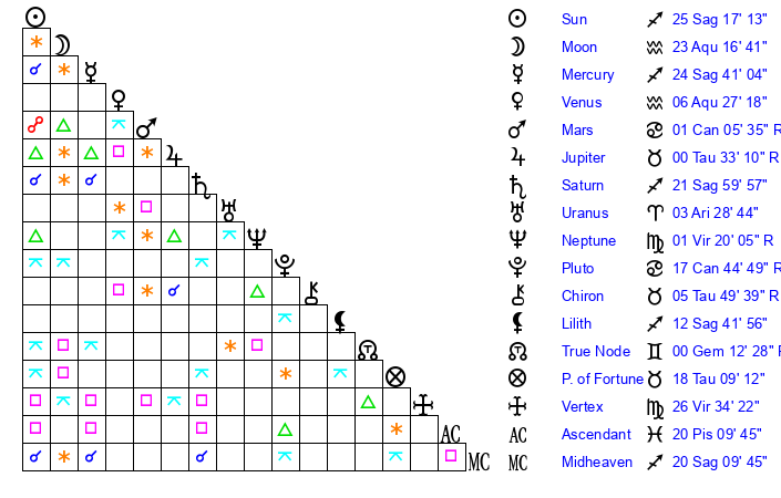 | Moon | 23 Aquarius 18 | 22 Cancer 54 | 9 Virgo 7 |