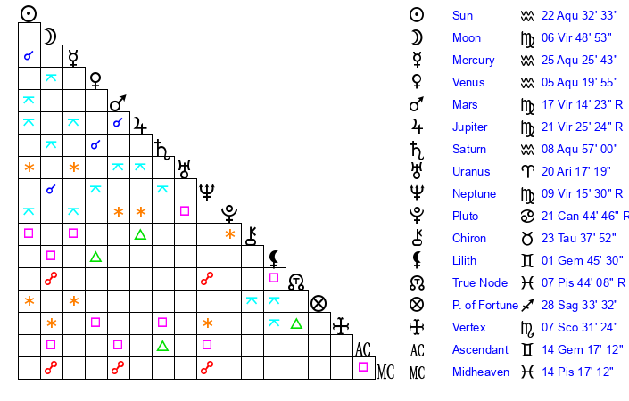 | Neptune | 9 Virgo 15 | 28 Pisces 17 | 7 Virgo 24 |