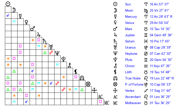 | Sun | 16 Aries 58 | 18 Aries 7 | 11 Leo 22 |