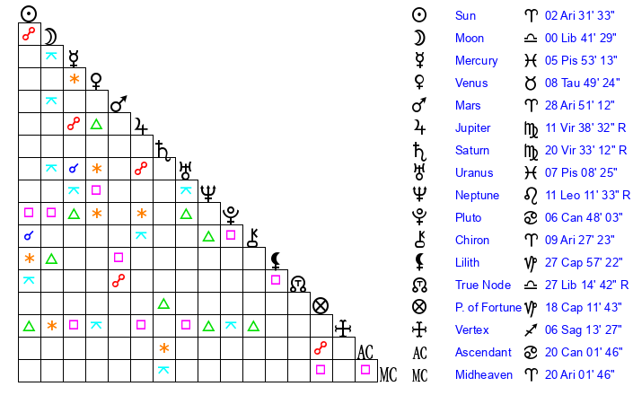 | Mars | 28 Aries 51 | 21 Cancer 7 | 11 Cancer 12 |